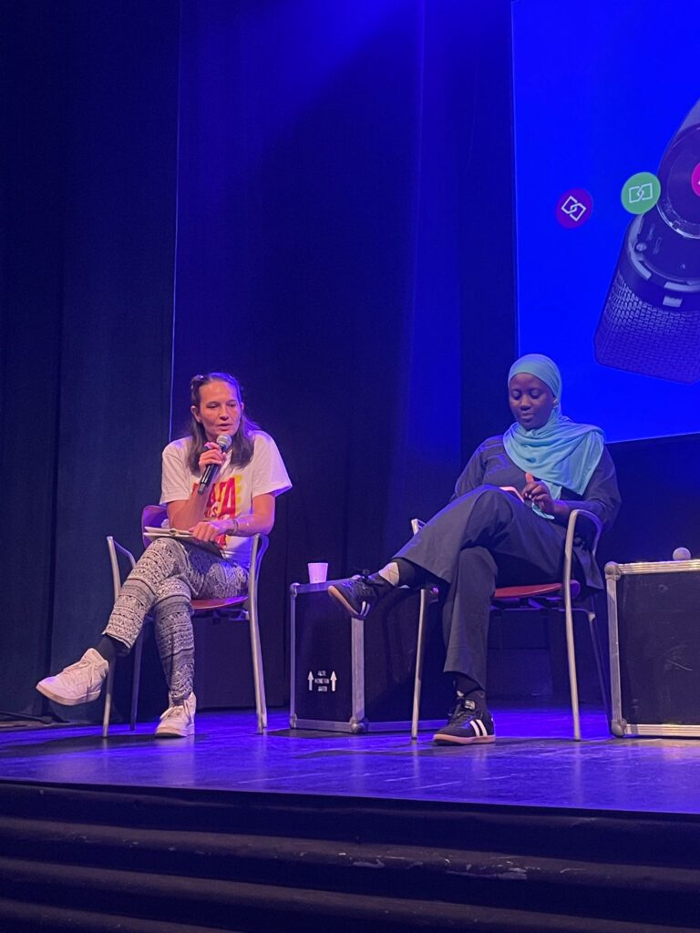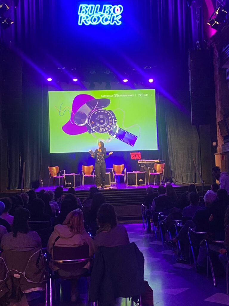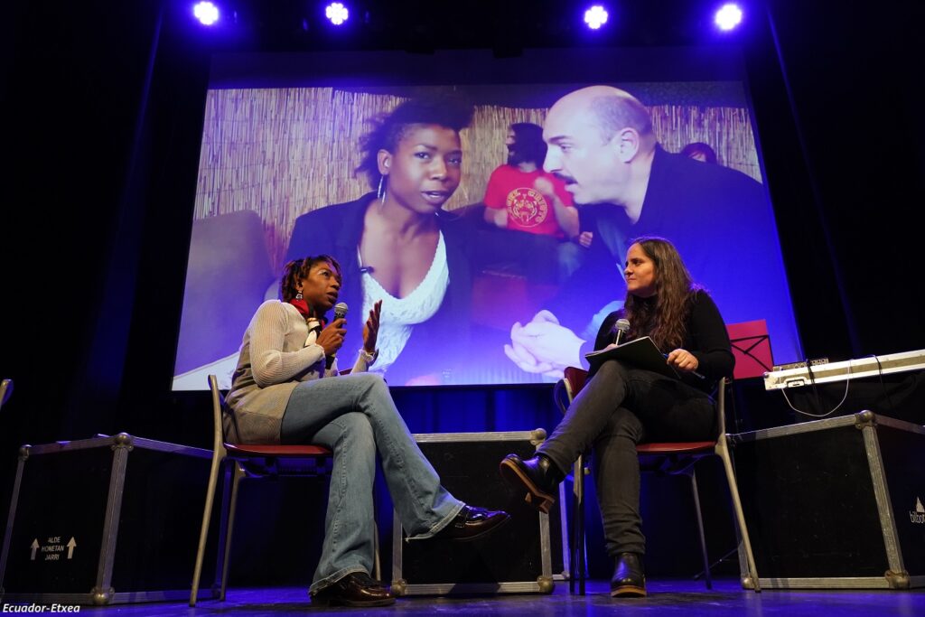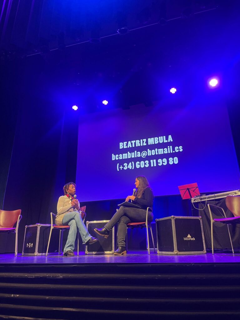 Primero llegaron las “Voces entretejidas”, una lectura coral de los poemas creados en el Taller de Letrillas, donde las autoras compartieron versos nacidos del trabajo colectivo. A continuación, la entrevista en primera persona entre la directora y guionista Beatriz Mbula y Marta García (de Zehar-Errefuxiatuekin) ofreció una conversación vibrante sobre identidad, relato y memoria.